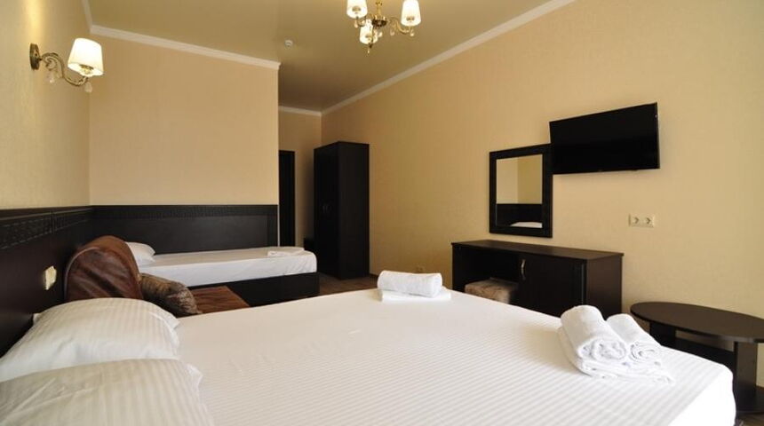 Однокомнатные номера для 2-х,3-х и 4-х человек со всеми удобствами: санузел, балкон, сплит-система, телевизор, холодильник, сейф, удобная мебель, интернет Wi-Fi.