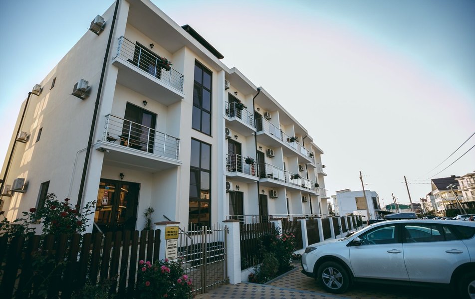 Современный двухэтажный гостевой дом расположен на улице Абрикосовой. |