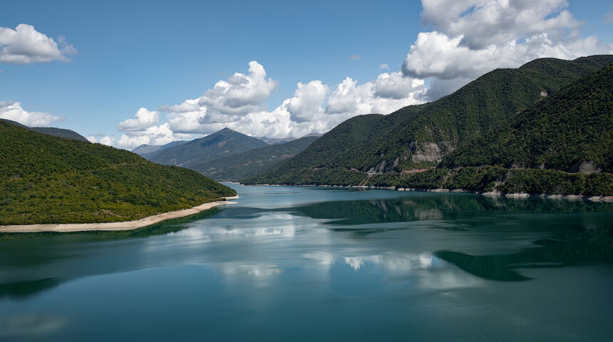 Жинвальское горное водохранилище, вода которого имеет необыкновенный бирюзовый цвет;